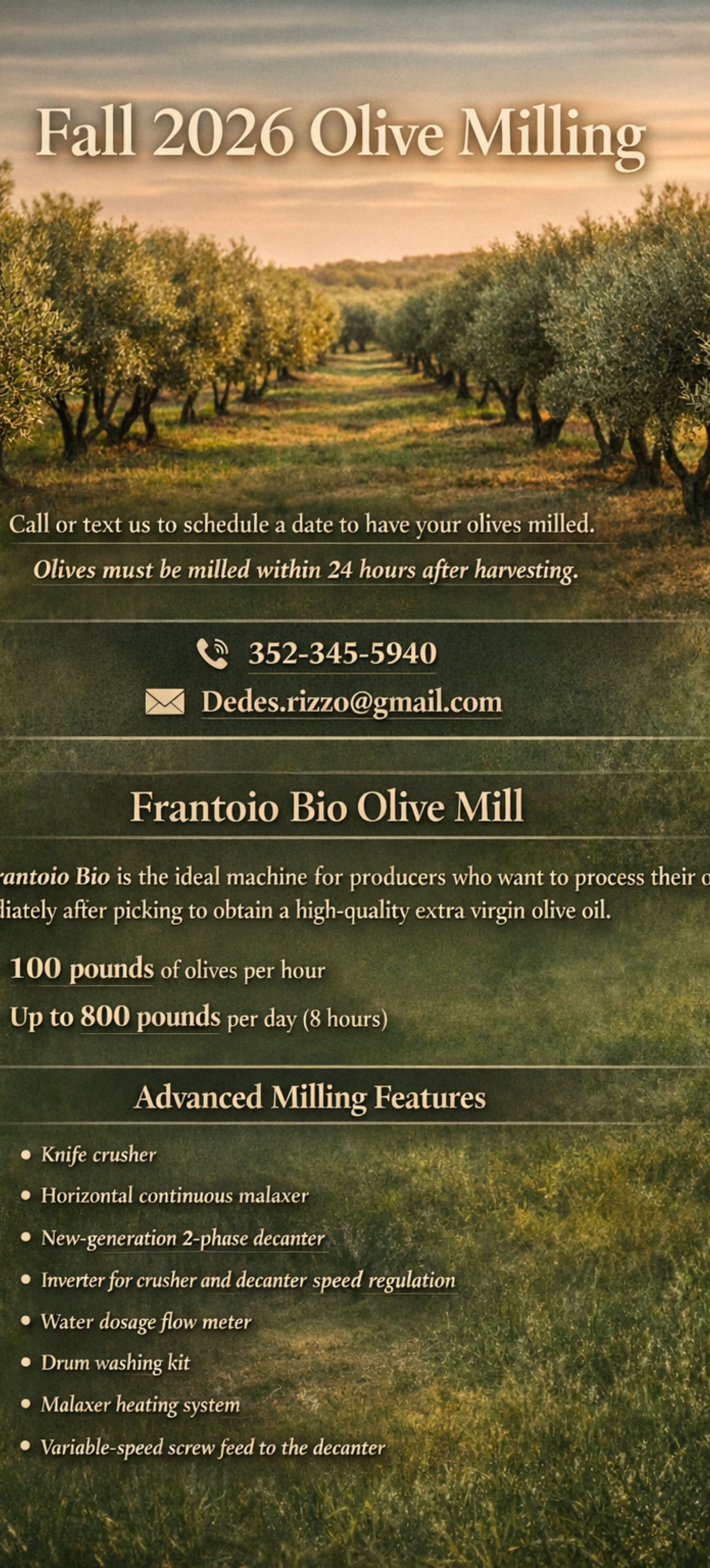 FALL 2026 call or text us to schedule a date to have your olives milled.
